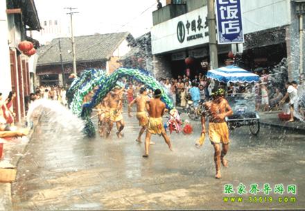 張家界潑水龍又叫“澆水龍”,于唐朝時期由移居本地的白族興起演變而成,在永定區(qū)的尹家溪鎮(zhèn)西尹村、莫家崗村十分盛行,是當(dāng)?shù)?a class="insidelink" href="http://m.gametablet.net/fengqing/1130174734.html" target="_blank" title="土家族">土家族,白族、苗族在天熱干旱時節(jié)求雨祈福的一種形式。一旦出現(xiàn)旱災(zāi),當(dāng)?shù)仡^面人物就會出來組織潑水龍,演出極其隆重。