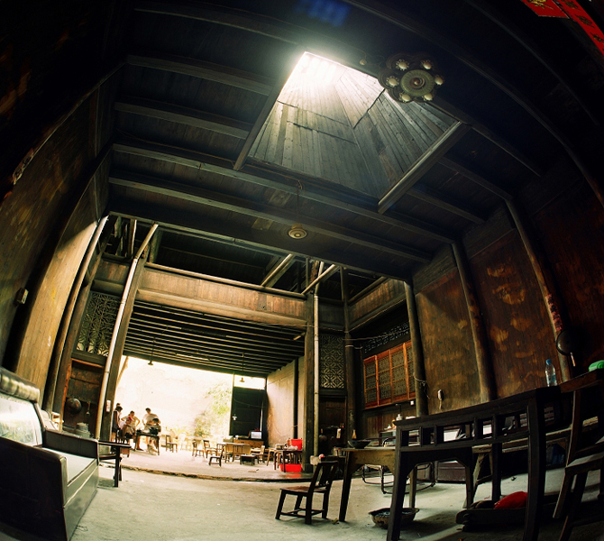 院內(nèi)廂房按家室的輩分依次居住。廂房的木窗雕龍刻鳳,每一板雕刻都是一個(gè)美麗的傳說。其中《梁?!贰ⅰ短煜膳洹?、《蚌殼燈》、《彩龍船》、《鼠叼葡萄》、《老鷹抓雞》等雕刻更是入木三分,惟妙惟肖。樓上則主要用于囤積貨物,擺放雜物、晾曬衣物等。后側(cè)建有伙房和廁房,院落后部則是花園,花園的盡頭緊連著河邊的私家碼頭。