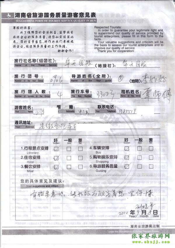 2010年9月6日 劉先生一行4人旅游質(zhì)量反饋:能積極為游客著想