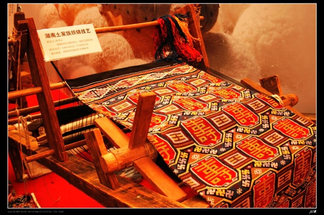 土家織錦,就是土家姑娘用一種古老的木腰機(jī),以棉紗為經(jīng),對(duì)五彩絲線或棉線(當(dāng)今也有用毛線)為緯,完全用手工織成的手工藝術(shù)品。土家織錦的藝術(shù)品種,經(jīng)過(guò)一兩千年的演變,現(xiàn)在已發(fā)展到100多個(gè),除原有的“西蘭卡普”(即被面花)以外,又根據(jù)時(shí)代的變化織出了各種圖案的壁掛、香袋、服飾、旅游袋、沙發(fā)套、坐墊、地毯、室內(nèi)裝飾等多種工藝美術(shù)品。聰明的土家姑娘,她們心靈手巧,表現(xiàn)山水,表現(xiàn)人物,表現(xiàn)樹(shù)木花卉與飛禽走獸,形象逼真,栩栩如生。 土家織錦產(chǎn)區(qū)主要分布在龍山縣苗兒灘、張家界、撈車(chē)及靛房、坡腳;永順縣縣對(duì)山、風(fēng)棲;保靖縣的普絨、清水等地。春秋戰(zhàn)國(guó)時(shí)期,“表布”(即土家錦)即已成為貢品。