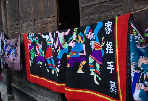 土家織錦在境域民間主要用于被面及小孩用的窩窩被、腳被、蓋裙,亦是姑娘陪嫁、定情及民俗活動(dòng)跳擺手舞時(shí)的披甲和祭祀用于堂前的壁掛。土家錦的圖案主要源于生活,已知名的達(dá)100余種,大致分為6大類:動(dòng)物題材有馬畢(小馬)、石畢(小動(dòng)物)、陽(yáng)雀花、燕子花、大龍紋、小龍紋、蛇花、貓腳跡、風(fēng)紋、蝴蝶牡丹和老鼠嫁女等;植物題材有蓮花、韭菜花、九朵梅、巖墻花、大刺花、藤藤花等;日常用具題材有椅子花、桌子花、箱子八勾、豆腐架、桶桶花、船船花、鋸齒花、梭子花、背簍花等;抽象幾何勾狀紋有單八勾、雙八勾、四十八勾、十二勾、二十四勾及勾紋變種紋飾;以吉祥文字表現(xiàn)的有福祿壽喜、萬(wàn)字流水、一品當(dāng)朝及田字紋、壽字紋等;取材天象的有太陽(yáng)花、整月花、半月花、梭羅花、滿天星等。 土家錦的織造方式,歷代沿用自漢代以來(lái)的腰機(jī)式斜織機(jī)。民間織機(jī)一般長(zhǎng)約5尺,寬約2尺多,高約3尺。所用材料,為蠶絲或棉線,用棉葉、棉梗、茜草、土靛、紫莓、土紅、黃珠子等物染色。