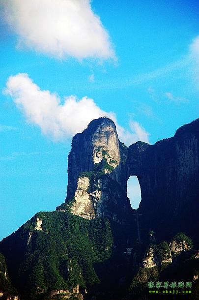 天門洞簡(jiǎn)介 天門洞是天門山最具有代表意義的景點(diǎn),它位于天門山山體的中上部,海拔1300米,門高131.5米,寬57米,深60米,是世界上最高海拔的天然穿山溶洞。 天門洞南北對(duì)開于千尋素壁之上,扶搖而通天,氣象變化萬(wàn)千,似明鏡似天門鑲嵌于蔚蔚天幕之上,終年吞白云吐紫霧,渲染著神秘莫測(cè)的氣氛而更顯出塵脫俗,正所謂奪盡天地之造化,藏盡天地之玄機(jī),而成為千古難解之謎,尋尋覓覓,終是難解。置身其間,宛如入身天宮帝閣一般,大有“我欲乘云仙飛去,直入九霄攬乾坤”之感。“天門洞開云氣通,江東峨眉皆下風(fēng)”元朝的著名詩(shī)人張兌曾這樣贊嘆,磅礴的氣勢(shì)由此可見。